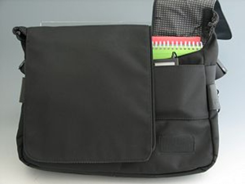 使っていると分かるのですが、この横長のタイプのカバンは収納のしやすさ、見通しの良さと引き換えに、フリップの開閉が大袈裟になってしまうという欠点もあるのです。まあ、仕事などで中のものを取り出す時などは、室内でカバンを降ろした状態で行うので問題はないのですが、ちょっとiPodを出したいといった、歩行中の取り出し作業に、幅が広いフリップをはね上げるのは、何だか大荷物を扱っているような気分になるのです。
