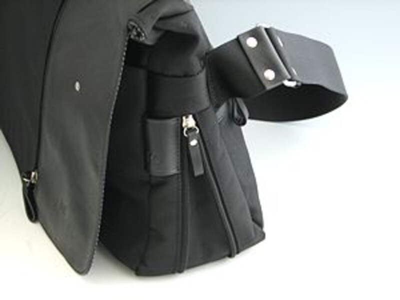 ストラップもメッセンジャーバッグに多い、カバンに対して斜めに付くタイプ。これは、ストラップを短くして、たすき掛けにした時に、ちょうど背中にカバン本体が来るようにと考えられたもの。また、長くして肩に直接掛けた時は、お尻の角度に合うので歩きやすいというメリットもあります。太めのストラップは頑丈で、しっかりしているのは良いのですが、着脱出来ないのは個人的に残念でした。