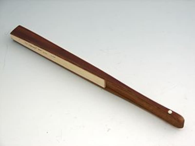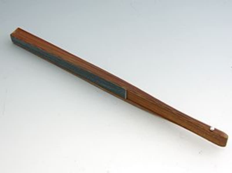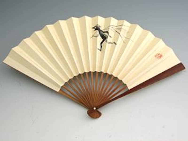 和紙に柿渋を塗って独特の艶を出すと同時に耐久性も強化した、古くからの男性用扇子が、この「渋扇」です。テレビドラマ「鬼平犯科帳」で中村吉右衛門丈が茶色の大振りの扇子を持っていましたが、あれが渋扇ですね。写真は、京都の宮脇賣扇庵さんのもので、竹部分のしなりが見事な、渋扇にすればやや繊細な、京都製ならではのものです。とにかく畳んだときの長さが30cmと大きなものなので、風量が大きく、暑い日にはとても重宝します。