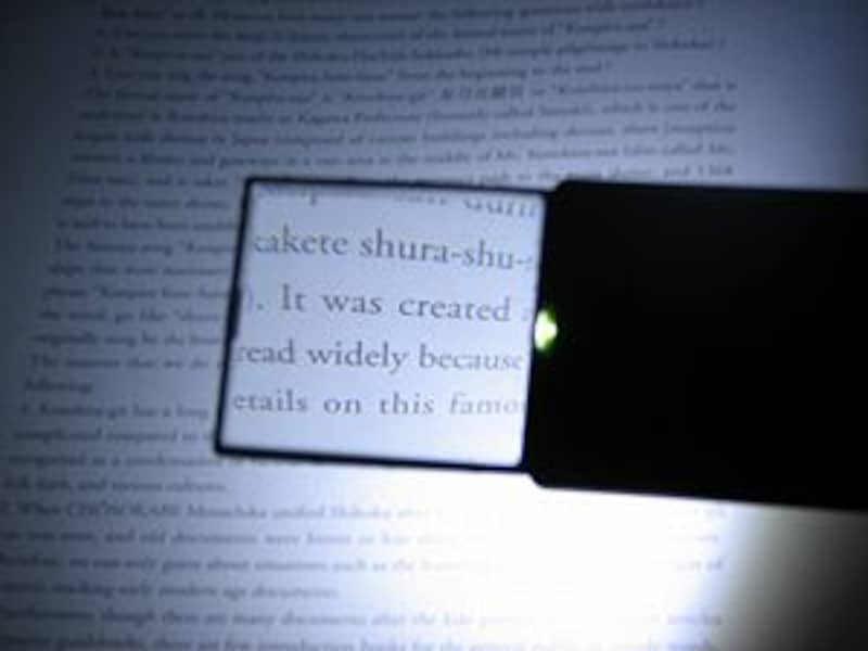 イージーポケットは、外装からルーペを引っ張り出して使うのですが、レンズ部分をさらに引っ張ると白色LEDが点灯します。このLEDの照射方向が抜群で、見たい部分を的確に照らしてくれます。これは実際に使っていて、最も感動した部分。小さな活字の画数が多い漢字のような、通常のルーペでは細部が確認できないものも、明るく照らした上で拡大してくれるので、細かい部分までハッキリ見えます。