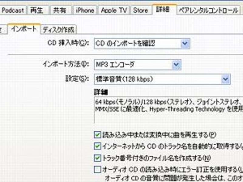 まず、iTunes上で「詳細」メニューを見ます。そこに「選択したファイルをMP3に変換」があれば問題ないので、そのまま次へ行きましょう(上の図版を参照)。そこに「選択したファイルをAACに変換」があれば、設定→詳細→インポートの中の「インポート方法」(Macの場合は、環境設定→詳細→読み込みの中の「読み込み方法」)を「MP3エンコーダ」に設定してから(下の図版を参照)、「juke tower」に持っていきたい曲をiTunesのライブラリ上で選んで、「選択したファイルをMP3に変換」を実行します。