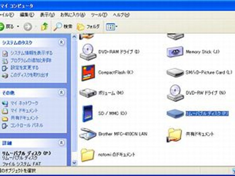 USBメモリ(1GBのもので約2500円前後)は1GBのものに約250曲くらい入ります。浴室などで聴くなら1GBか2GBのもので十分でしょう。そのUSBメモリをパソコンのUSB端子に挿し込むと、Windowsなら「マイコンピュータ」、Macならデスクトップ上にUSBメモリのアイコンが現れるので、それをダブルクリックします。