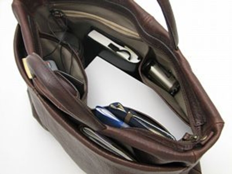 実際、カバンを開けたままで持ち歩けるというのは、本当に便利で楽なものです。そりゃトートが流行るわけだと思いましたが、この「TENERA」の場合、外観はブリーフケースなので、さらに利用範囲が広がります。これらの使用例写真を見てもらえば分かるように、中の見通しもとてもよく、柔らかいボディなので、把手を開けば口も大きく開いて、小さなモノも探しやすいのです。