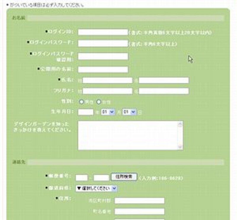 サービスの概略を手っ取り早く知ってもらうために、ブックカバーを作る過程を紹介しましょう。まず、会員登録ですが、ここでは住所や氏名の他、銀行口座の登録が必要なので注意して下さい。後で説明しますが、このデザインガーデンは、自分でデザインした商品を販売することが出来ます。その際の売り上げのロイヤリティを振り込んでもらうために、口座の登録が必要なのです。
