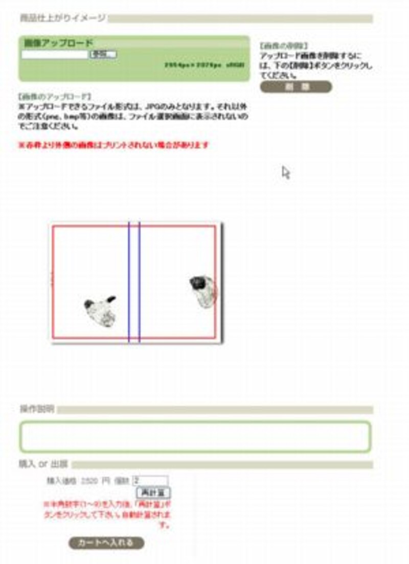 画像が出来たら、後は、クリエイター会員のIDでログインして、ブックカバーの製作画面に行きます。そこで画像をアップロードして、何個作成したいかを入力、「カートへ入れる」ボタンを押せば出来上がりです(赤線の範囲外は印刷されない可能性があると書かれていますが、実際作ってみたところ、きちんと印刷されていました)。後は購入手続をすれば、10日ほどで商品が届きます。送料は別途必要ですが、個数が少なければメール便が選べるのでかなり安上がりです(ブックカバー4枚程度や、Tシャツ2枚程度なら、メール便でOK)。