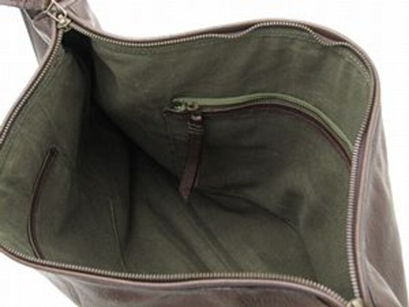 鞄の内部は、オープンポケットが二つと、大きめのファスナーポケットが一つというシンプルなもの。元々、口が大きく見通しが良いので、モノの出し入れはスムーズで、下手にポケットが多いと逆に使いにくい感じです。この最小限のポケットだからこそ、カジュアルに便利に使えるのだなあと、2ヶ月ほど使った今では思っています。何でも、ガチャガチャと放り込んで、サクっと肩に掛けて出かけるというのが、とても似合う鞄でした。Tシャツ一枚でも、ジャケットでもそれなりに似合ってしまうのは、デザインのさりげなさに加えて、やはり革の質感の良さです。良い革で、くたっと作る魅力は、m+ならではですね。