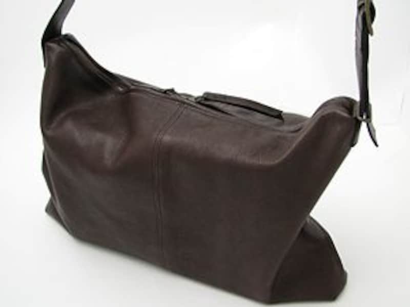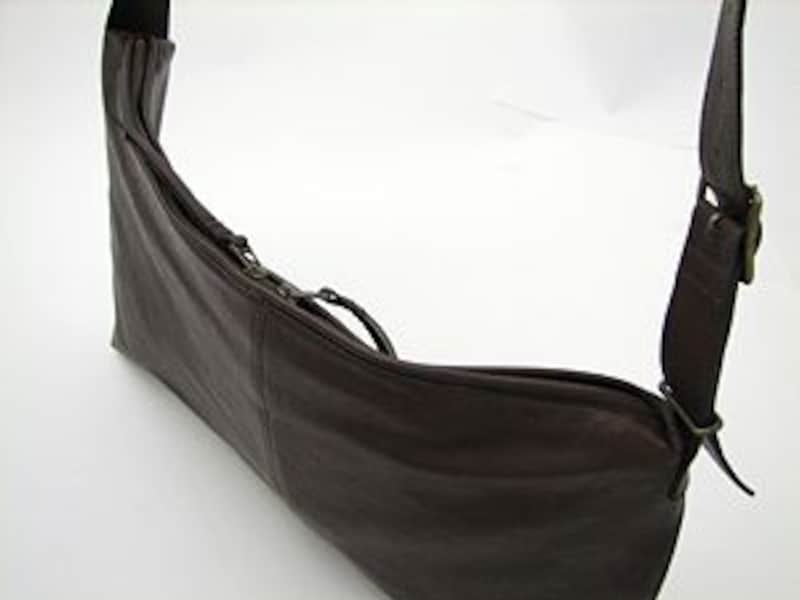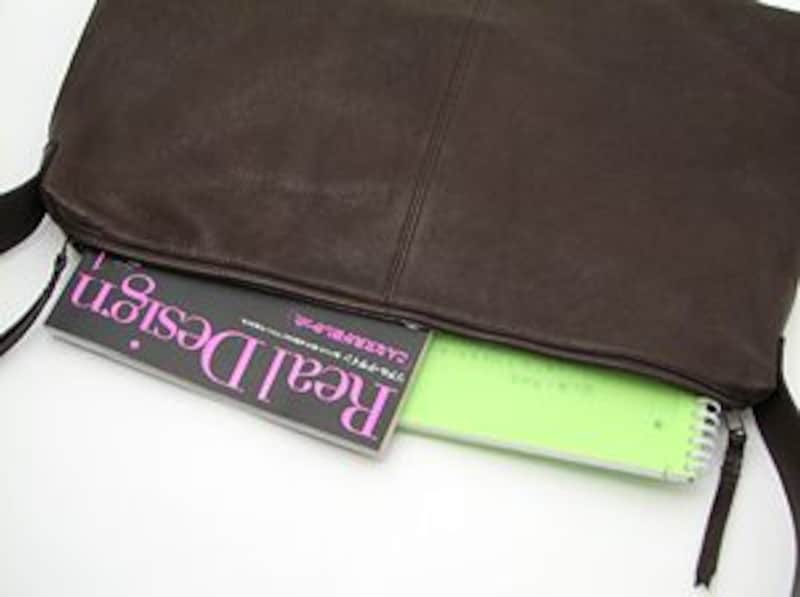 しかも、マチが薄く作ってあるので、上の写真のように雑誌を数冊入れてるだけだと、とてもスリムです。しかも、革が柔らかいので身体に纏わりつくような感じで身に着ける事が出来ます。歩いていても、角がなくて、柔らかいので、鞄が身体に当たって痛いということもなく、不必要に揺れる事もなく、快適に歩く事ができました。普通に肩に掛けても良いのですが、たすき掛けにすると、一層鞄が身体にフィットして、荷物も軽く感じます。
