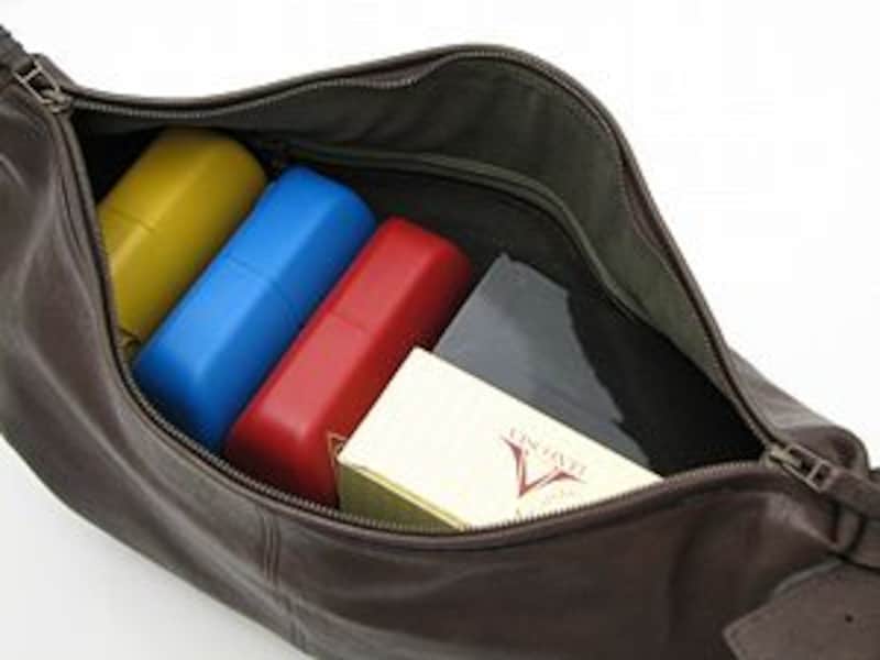 また、上の写真のように、大きな荷物も楽に収納してくれます。写真では、スタートレック・ファーストシリーズ(いわゆる「宇宙大作戦」ですね)のDVD全巻と、CD12枚と本がセットになった「CDブック 百器徒然袋 雨・風」(講談社)、それにヴィスコンティの製品ケース(これがまた豪華で大きいのです)を入れていますが、この程度なら、楽勝で収まるのです。この上に、手帳やiPodなどの日頃持ち歩くグッズを入れる事も出来ます。その収納力はかなりのものです。
