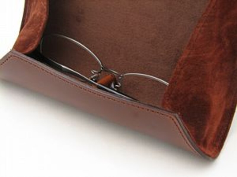 イタリア製のタンニン鞣しの革はオイルを多めに含んで、丈夫ながらも触り心地は柔らかく、使い込んだらどれだけ良い感じに育つんだろうと期待させる感じです。色は黒と茶色の2色ですが、特に写真でも取り上げている茶色の色の良さ、風合いの良さは相当なものです。写真では、その魅力を伝え切れないのが残念ですが、この革の良さだけで、ガイド記事を書きたいと思いました。それほど良い感じですし、中の眼鏡に対して、安心感がある素材だと思いました。