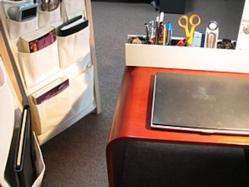 例えば、リビングのソファの前に、小さなテーブルを置き、そこに普段使う小物や筆記具を収納したALSTRAINの「DESKORGANIZER」を乗せます。さらに、雑誌やノートを収納したWORTHY WORK PLUSの「フレキシブルラック」をパティションのように設置。テーブルの家にノートパソコンや普段使いのノートを広げれば、十分使える書斎の完成です。「DESKORGANIZER」は、テーブルの大きさに合わせて、30cmか45cmを選びます。