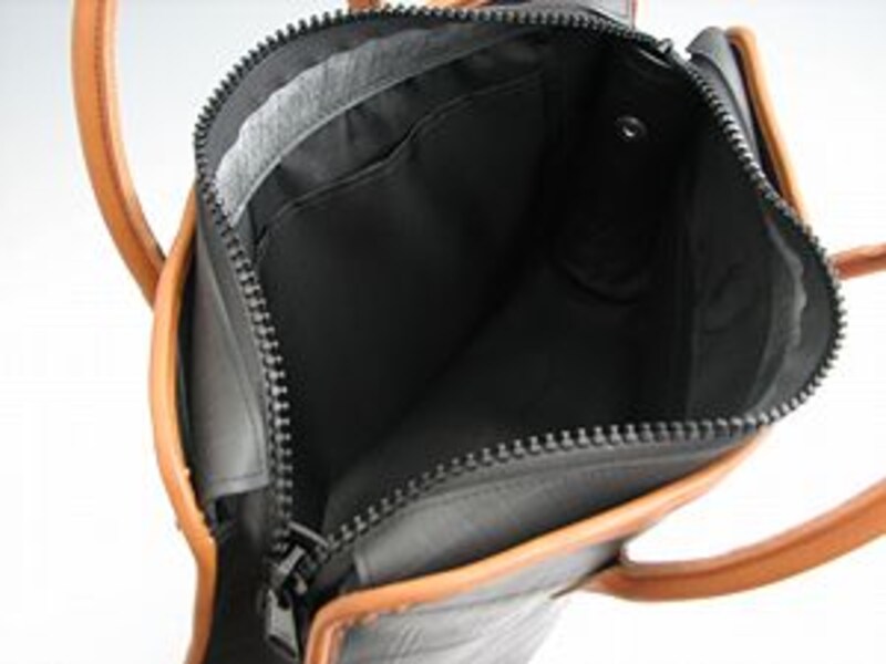 内装もシンプルなビジネスバッグです。薄マチなのでポケット類をゴチャゴチャ付けるよりも、片面にポケットを集中して、室内を広く使う仕様は正解でしょう。タイヤチューブの堅牢性を考えると、ノートパソコンの収納もOK。ショルダーバッグ同様、裏地無しのミニマムなスタイルなので、実際の容量に比べて、見た目はかなりスマートです。