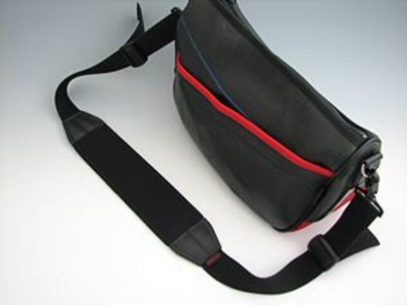 ただ、素材の魅力を最大限に見せるために、鞄の構造自体はとてもシンプルですし、機能的にちょっと物足りない部分もあります。そこで、ガイド納富は、今まで紹介した鞄補助グッズと組み合わせてみました。まずは、ガイド記事「ストラップを替えるだけでカバンが軽くなる」で紹介したOP/TECH社の「SaveOn ShoulderStrap」を付けてみました。これだけで、鞄がかなり軽く感じられます。