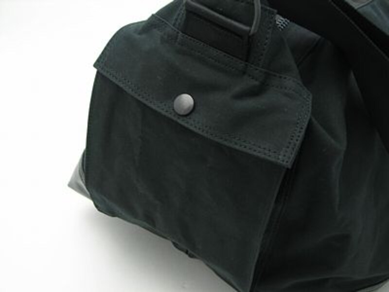また、ショルダー状態でもトート状態でも使える、サイドポケットが両端に付いています。このポケットは、広がり過ぎない程度にマチがついているので、iPodとイヤフォンとか、厚手の文庫本やほぼ日手帳などが収納出来ます。スナップは留められなくなるものの、ペットボトルやタンブラー、折畳み傘を突っ込んでおくことも可能です。また、スナップの留め具の下に指が入るので、開閉がとてもスムーズ。このあたりの配慮こそ吉田カバンの大きな魅力だと思います。