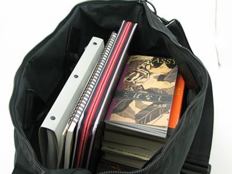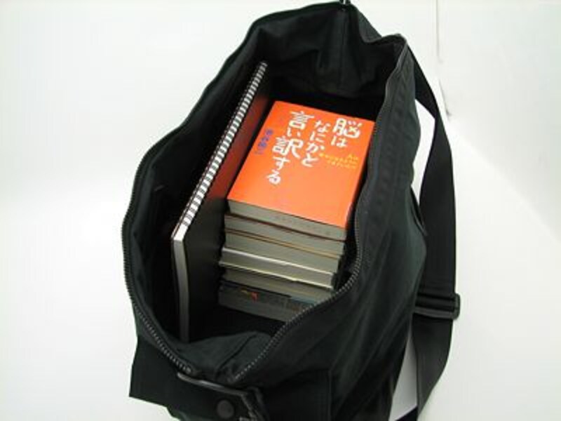 ショルダーバッグ状態でも、上の写真のように、単行本を7冊入れても、まだまだ余裕の大容量(A4を寝かせて入れられるマチの広さが凄い)。それでいて、少ない荷物の時には、少ないなりにスッキリと収納出来て、高さが抑えられているので、見た目はスマートです。底のマチが折り畳めるので、休日に、手回り品だけ入れて出掛けるのにも使えるようになっています。ガイド納富の購入ポイントは、この「手回り品だけ入れて出掛けるのに使える」という部分でした(単に、出掛けると、いつの間にか荷物が増えてしまう体質だからかもしれませんが)。