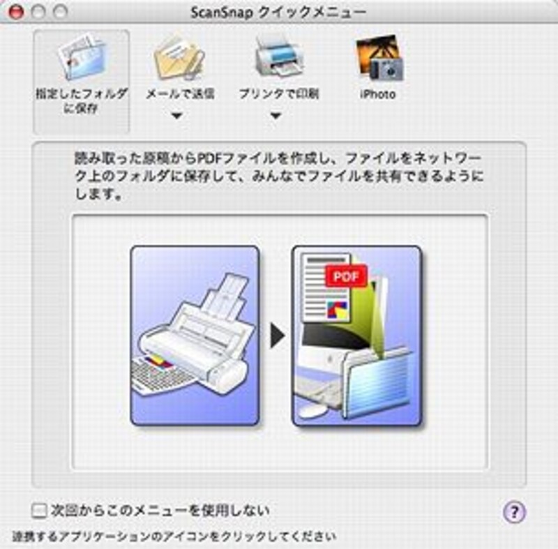 取り込みが終了すると、上のような画面になるので、ここでファイルを保存するか、iPhotoに持っていくか、メールするか、プリントするかを選択。使う先が同じなら、一度選択して設定すれば、この画面なしで直接、設定した動作に移行します。ガイド納富は、ここでiPhotoを選択。取り込んだ画像は、あらかじめ初期設定で指定したフォルダにPDFファイルとして保存され、そこから画像ファイルが取り出されて自動的にiPhotoに登録されます。