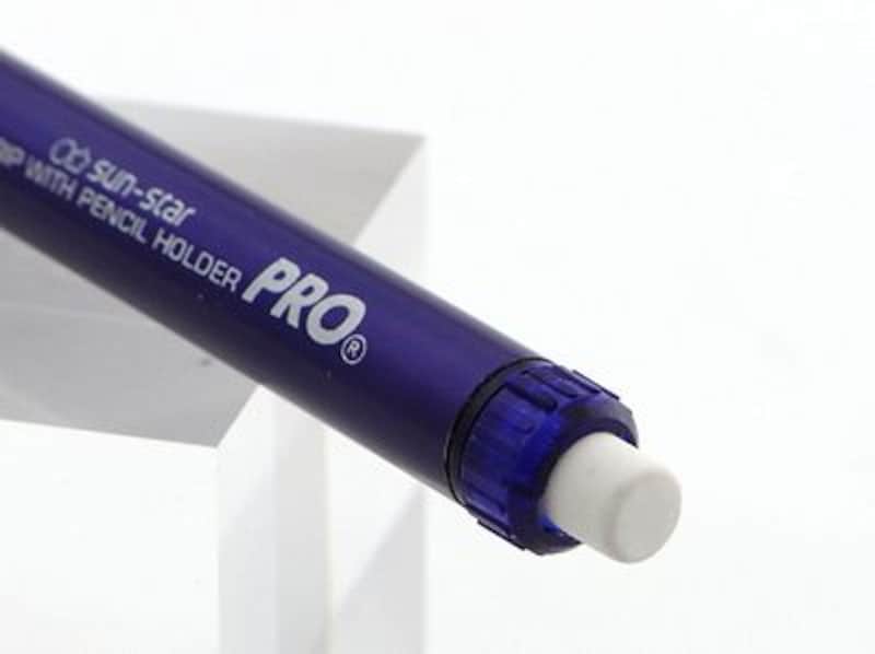 また、後部には繰り出し式の消しゴム付き。37mmの長い消しゴムなので、かなり実用的です。しかも、消しゴムの予備も一本付属しています。これで189円は、かなりお得。比較的長い鉛筆も入れられるので、補助軸としてより、鉛筆用のグリップとして使いたい製品です。ただ、調べてみたところ、青は販売が終了しているようです。