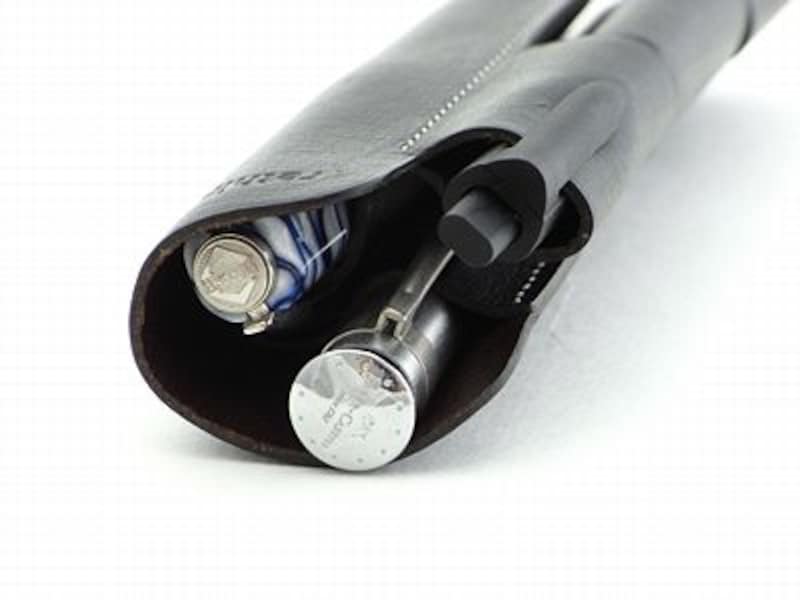 | 普段使いの一本を挿す外側のフリップが留め具にもなっている構造 |