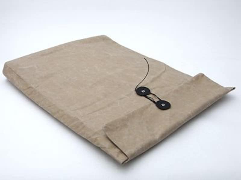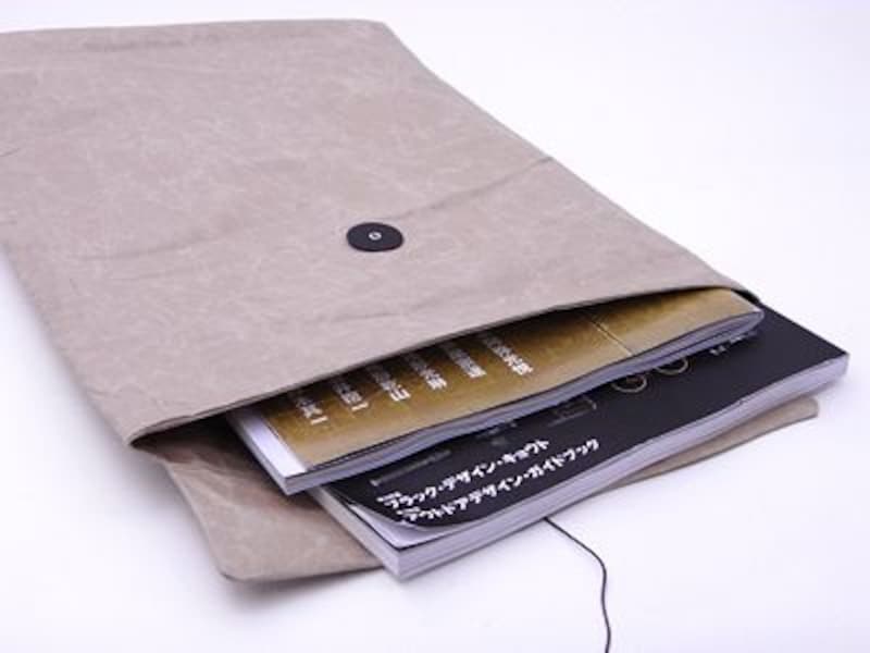 SIWAブランドからは、ナオロンを素材にした様々な製品が発表されていますが、中でも、ガイド納富が面白いと思ったのは、前ページで紹介したカバンと、既にガイド記事で紹介済みのメガネケース、そして、これから紹介する「ひも付き封筒」と「ブックカバー」でした。この、柔らかいけれどしなやかで強靱という素材は、見た感じが多少くったりした方が似合うグッズに使われていると、とても魅力的に見えると思うのです。