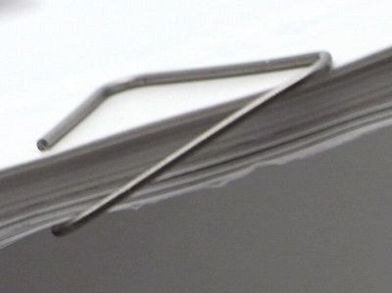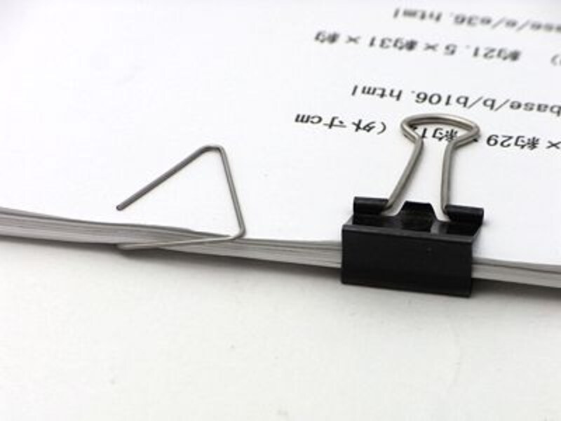 こんな風に、ダブりクリップで綴じるのに比べ、嵩張らないのが何よりの魅力。これなら、綴じた紙を重ねて保存することも出来ます。バネ用のステンレス製なので、耐久性も高いのが嬉しいですね。