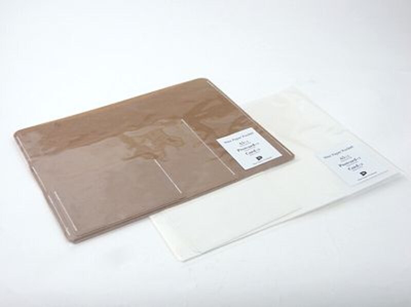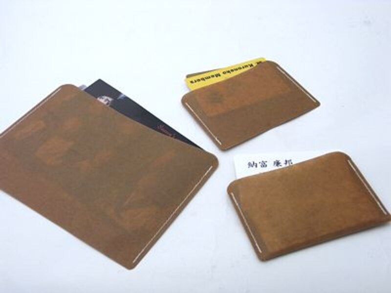 ワックスペーパーファイルはA4用紙をファイルするサイズですが、それより小さい、A5サイズ×1枚、ポストカードサイズ×1枚、名刺サイズ×2枚がセットになった姉妹品「WAX PAPER POCKET」も用意されています(三方が縫われているので、ファイルでなくポケットなのですね)。案内ハガキなどをまとめて鞄に入れる時などに便利なポストカードサイズ、名刺やショップカードの整理に重宝する名刺サイズ。どちらも普通にある製品ではあるのですが、素材がワックスペーパーだと、不思議な味わいが感じられます。