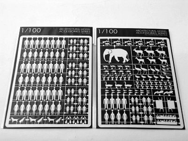 | かみの工作所 左「1/100 建築模型用添景セット No.3 基本編」 右「1/100 建築模型用添景セット No.4 井の頭自然文化園編」 各1,575円(税込)色は黒もある |