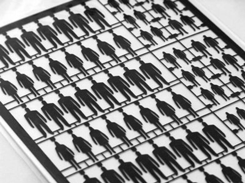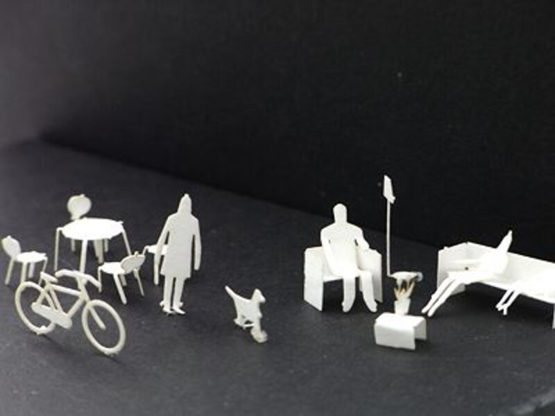 例えば、この「1/100 建築模型用添景セット」は、その名の通り、建築模型の中にセットして臨場感を得るための、人や家具の模型(というか影型とでも言うのか)です。本来は、不動産屋や設計事務所で使うものなのですが、個人でも例えば、部屋探しや、部屋の模様替えのシミュレーションに重宝します。
