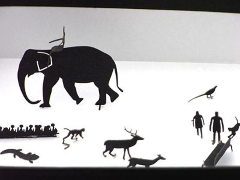 白背景に使う「黒」と、黒背景用の「白」の二色が用意されているのも、細かいけれど嬉しい配慮。プラモデルを作るように、枠から切り取って、折り曲げて形を整えたり、動きを表現したりして、小さな箱の中に糊付けしていくだけでも、何だかとても楽しいものです。しかも、それぞれのパーツの造形がとても良く出来ていて(象の耳の切り込みや、自転車のスタイリングの良さなどに注目してください)、その精巧さと、紙であるという温かみやフレキシブルさの融合が、この製品をとても魅力的なものにしているのだと思います。