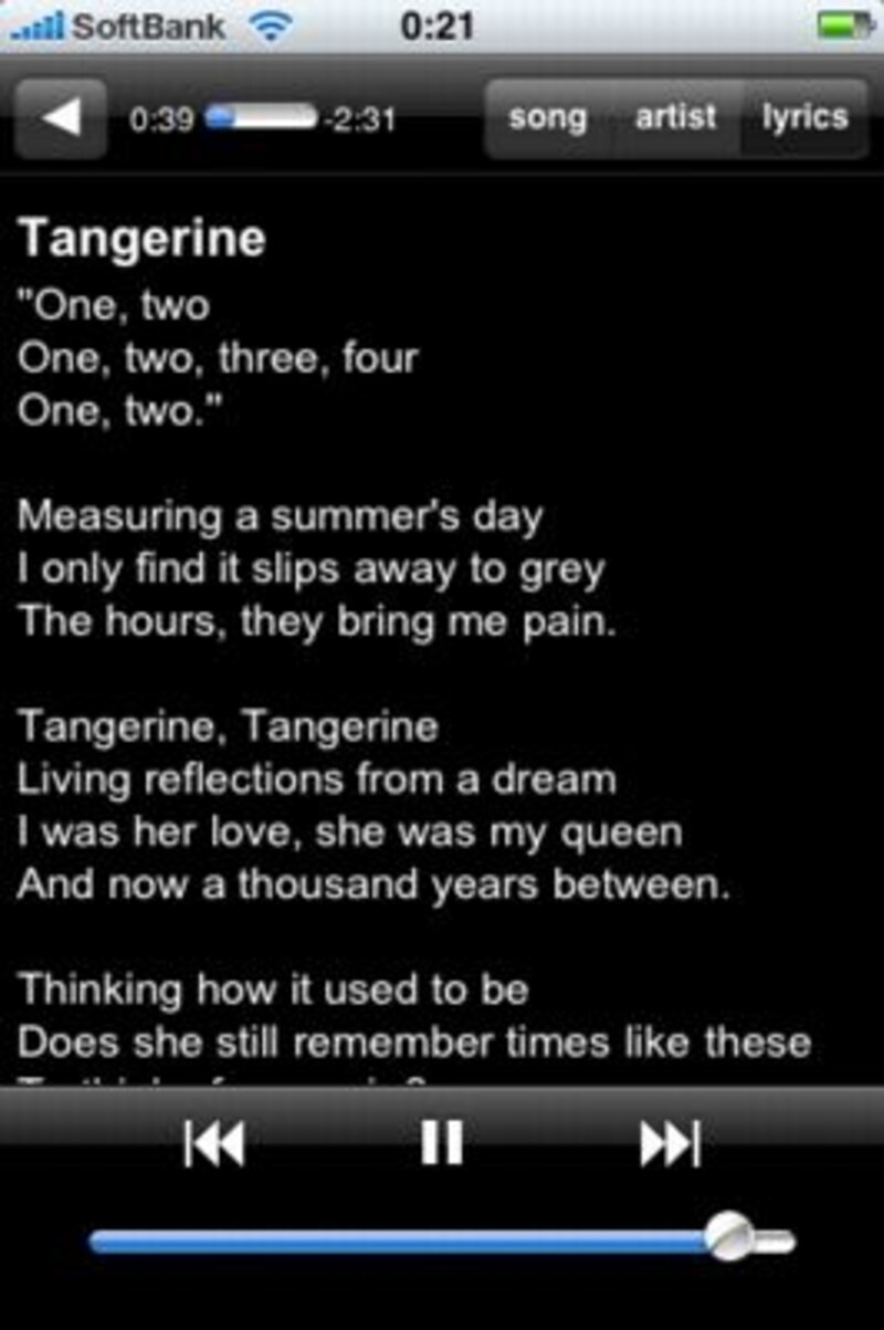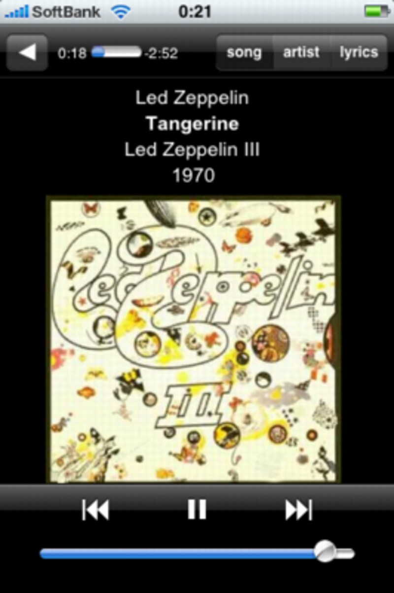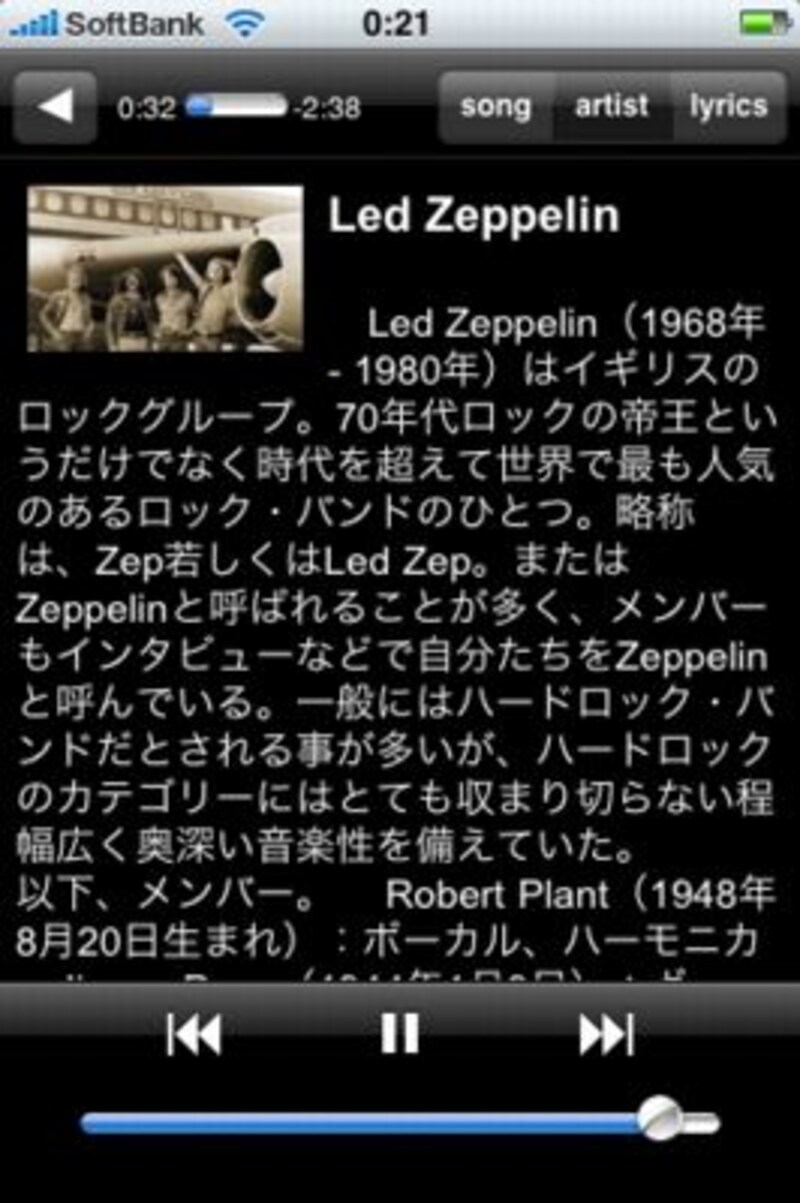 しかも、それだけではありません。このアプリからライブラリを呼び出して、音楽を再生すると、そのアーティスト情報や歌詞も、ネットから自動的に検索して表示してくれるのです。iTunesに登録していない歌詞が表示されるので、最初は驚きましたが、ネットの歌詞データベースに情報があれば表示してくれるようです(なので洋楽の歌詞の方が充実しています)。