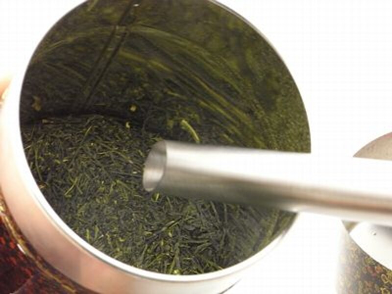 ドイツ製なので、本来は紅茶を淹れるための道具なのでしょうが、日本茶も普通に淹れられます。筒の斜めにカットされた側を、茶缶に差込んですくい上げれば、お茶一杯分の茶葉が筒に入ります。計量する必要もないですし、茶葉をこぼす心配も少ないです。