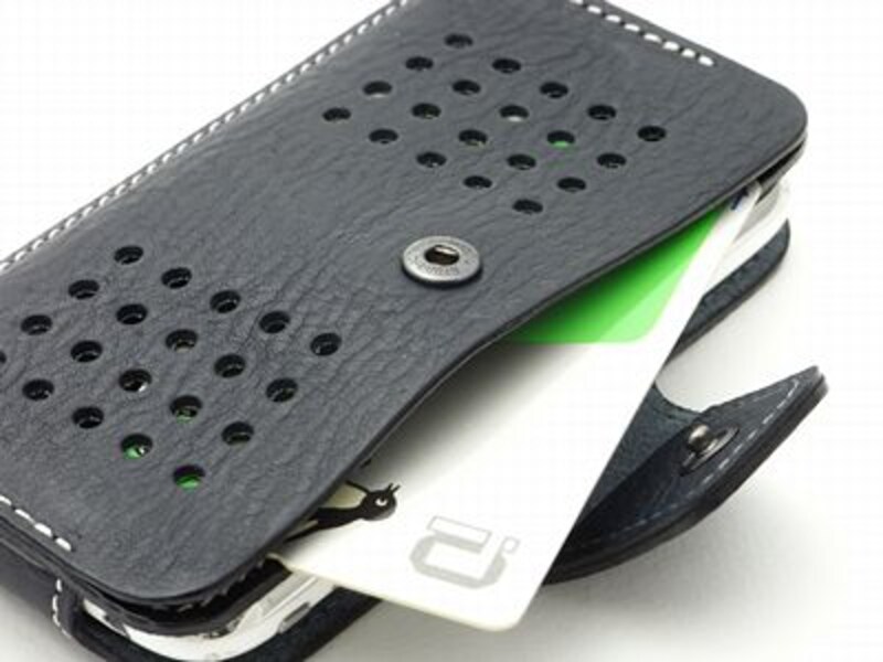 | ポケットにスイカなどのICカードが入れられる。穴は古いラジヲケースを意識したデザインだ。 |