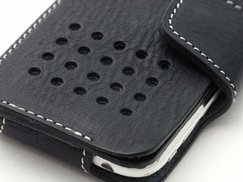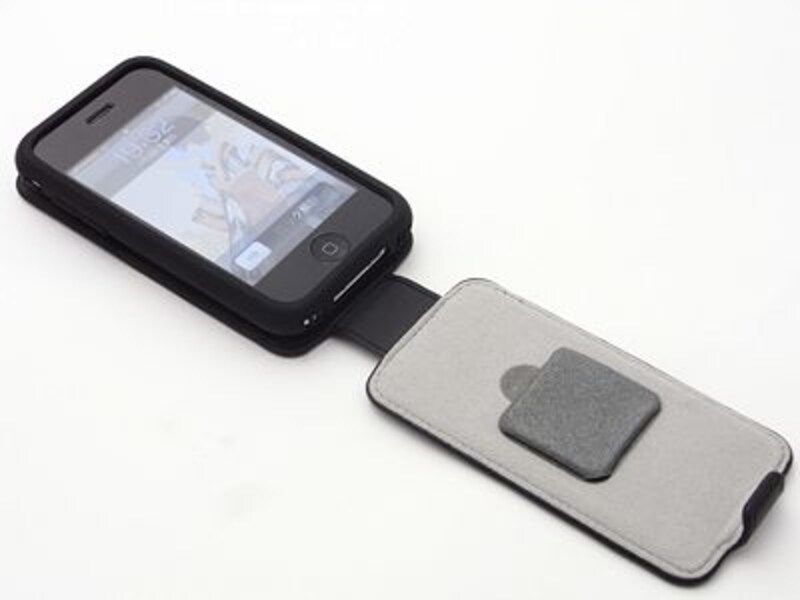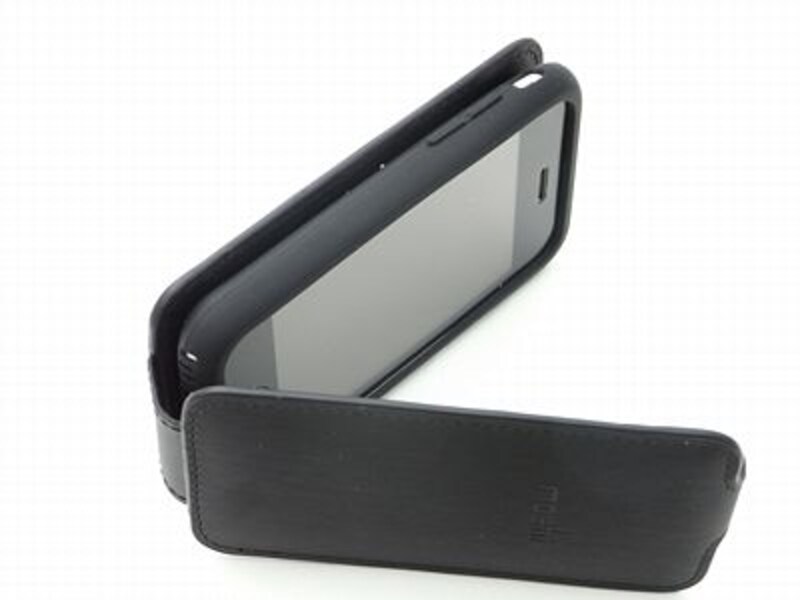 ケースに入れたままで操作するというパターンの場合、iPhoneの最大の特徴でもある、大きなタッチパネルをどう扱うかがポイントになります。「concerti」の場合は、上から下に、縦に開くフリップタイプになっています。この「縦開き」は、iPod用ケースの伝統のパターン(現rethinkの守川氏が発案、開発して世界中に広まったスタイルです)。それだけにiPodユーザーには馴染み深いのも、このケースのアドバンテージかも知れません。また、iPhoneをケースに固定する部分のみにシリコン素材を使い、最小限のスペースでiPhoneを固定しているのも良いアイディアです。