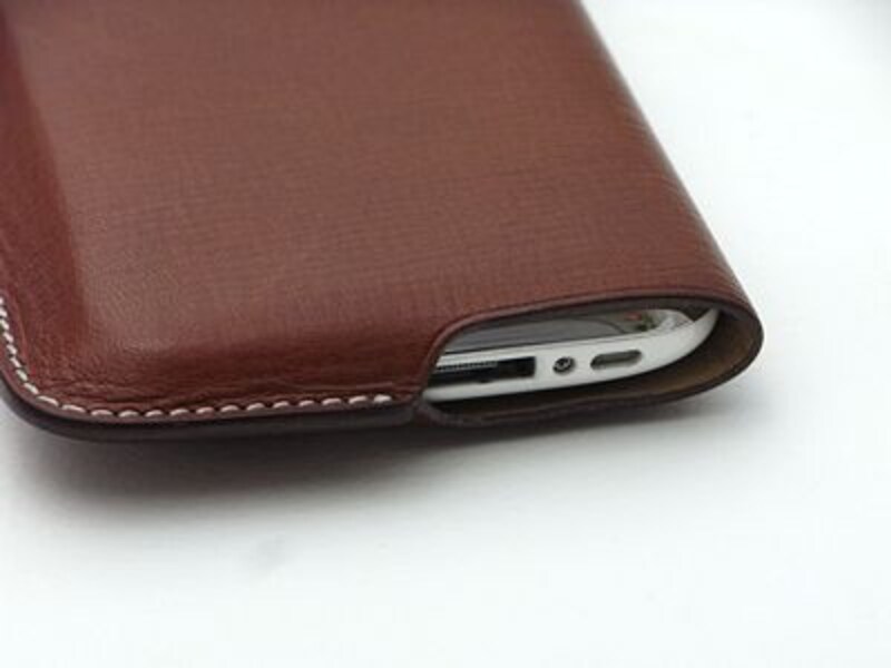 「美しさでは文句無くナンバーワンですね」と戸津さんが言うように、iPhoneにぴったりと一体化したかのような装着感は、まるでiPhoneに革張りしたようにも見えます(茶色のケースだと、ちょっと、往年の名作ポラロイドカメラ「SX-70」にも似ています)。実際、使っているうちに、革がiPhoneの曲面に沿うように馴染んできます。この一体感は、「ベタ貼り」という手法(牛革を極薄に漉いて貼合せる手法)を用いることで得られる、薄さとしなやかさ故です。タンニン鞣しの革は、使い込むことで、さらにしなやかになり、表面に艶が出てきます。コバの磨きも見事で、ここまでの素材と技術を注ぎ込んだiPhoneケースは、世界中を探しても見当たらないのではないでしょうか。