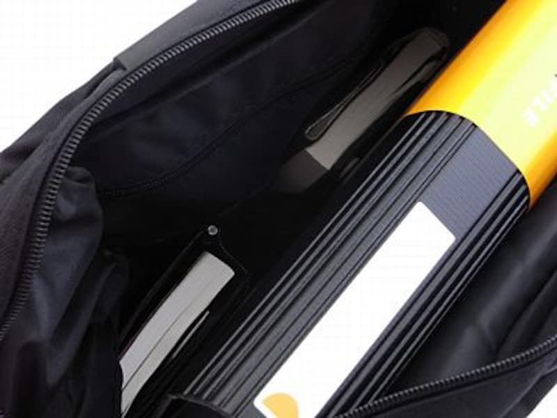 | 背面のポケットは、キャリーバッグのハンドルに挿し込む機能も持つ |