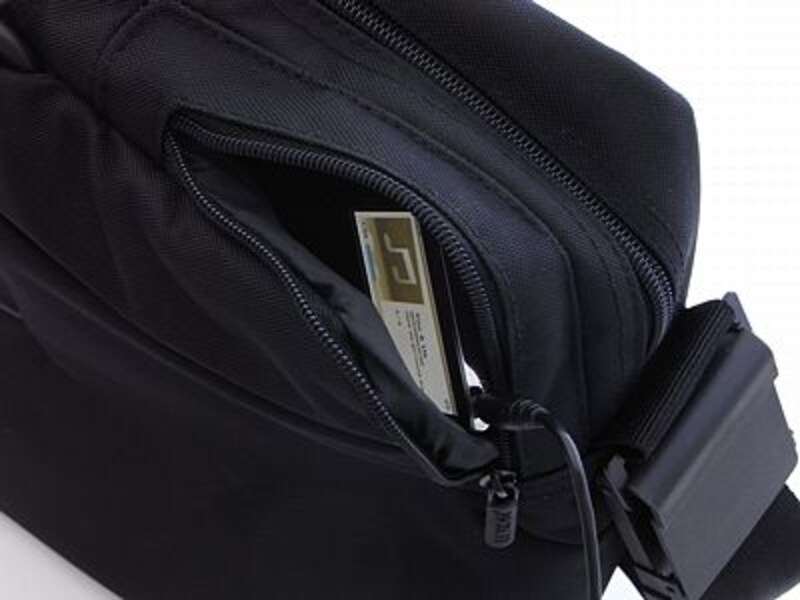 外側下のポケットは、文庫本には少し小さいサイズで、デジカメやスマートフォン、またはメモ帳などを入れるのに適した感じです。面白いのは、肩口のファスナーポケット。ここは、多分iPodや携帯電話を入れる事が想定されていると思うのですが、このポケット部分、きちんとポケットの袋部分が固定されるようになっていて、この手のポケットにありがちな、中でぶらぶらと内容物が動くことがありません。