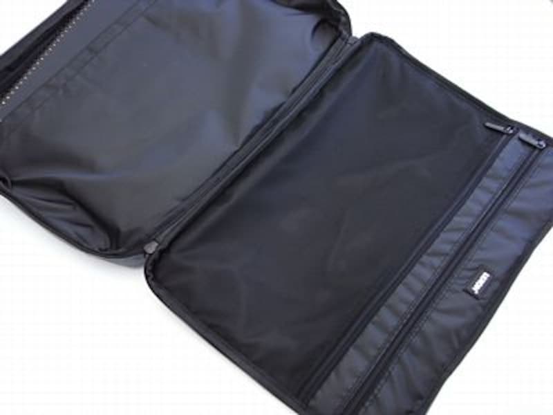 | 180度開くフラットオープンタイプは、マチが薄い(3.2cm)割に収納力がある |