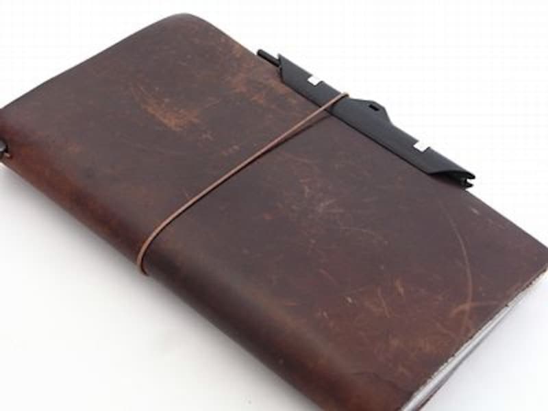 | 銀座五十音オリジナルの革表紙のメモに付けてみた。表紙部分に取り付けると、書くにも見るにも良い感じ |