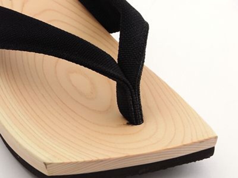 和工房みずとりの「男の下駄 茶人」は、そんな下駄と雪駄の良いとこ取りのような履物。雪駄の形状を削り出しのひのきで再現した、言わば木製の雪駄なのですが、実際に履いてみると、鼻緒を挟む指に力を入れなくても、足の裏にぴたりと追従してくれるので、下駄に慣れない人でもかなり歩きやすい、本当に、雪駄のような感覚で履ける下駄になっていました。