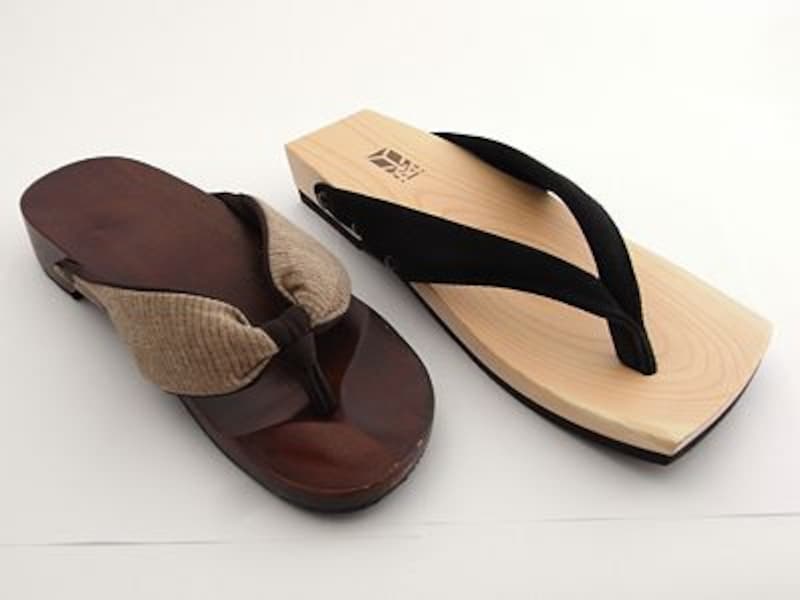 | 左がガイド納富愛用の「手彫り下駄」、同じ下駄でもコンセプトが違うと、これだけデザインも違ってくる |