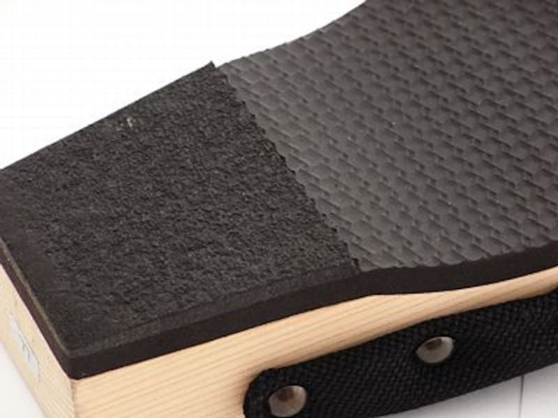 | 裏は、前方にゴムの滑り止めがかかと部分は柔らかめのプロテクターが貼られている |