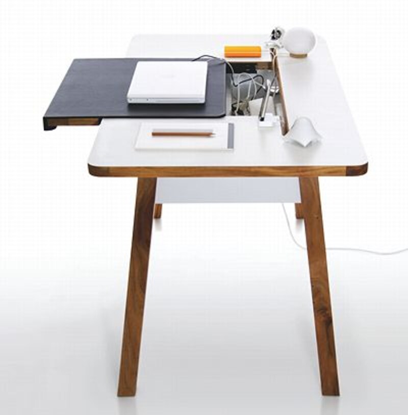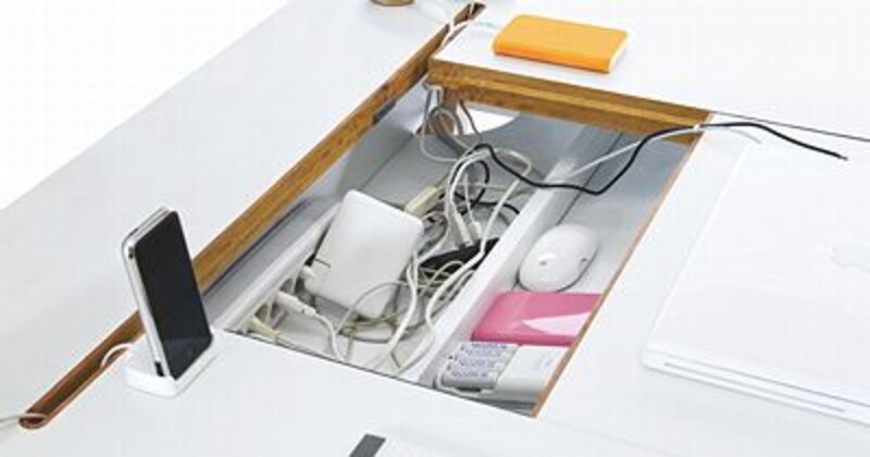 「StudioDesk」の仕掛けは、実に単純です。天板をスライドさせると、そこには収納スペースが用意されている、それだけです。そこに、電源タップを放り込んでおけば、机上で使う電源関係、例えば、ノートパソコン、iPod、携帯電話、照明機器といったツールの電源ケーブルは一括で管理出来ます。さらに、USBハブも入れておけば、パソコンとiPodなどの機器の接続用ケーブルも、机の上を這うことなく、すっきりと管理出来る訳です。