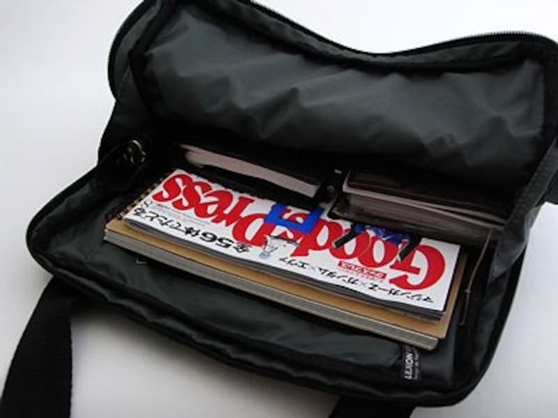そして何より便利なのが、大きく開く口です。サイドまでファスナーが下りるので、縦型ながら奥に入れたモノにも簡単にアクセス出来るし、中を一覧するのにも便利。もちろん、出し入れも楽々。サイズ的にも写真でお分かりのように、A4サイズの雑誌やノートをゆっくりと収納出来ます。サイドに小さなマチが付いていて、大きく開くけれど開き過ぎないのも、実際に歩きながらの使用にとても有効でした。