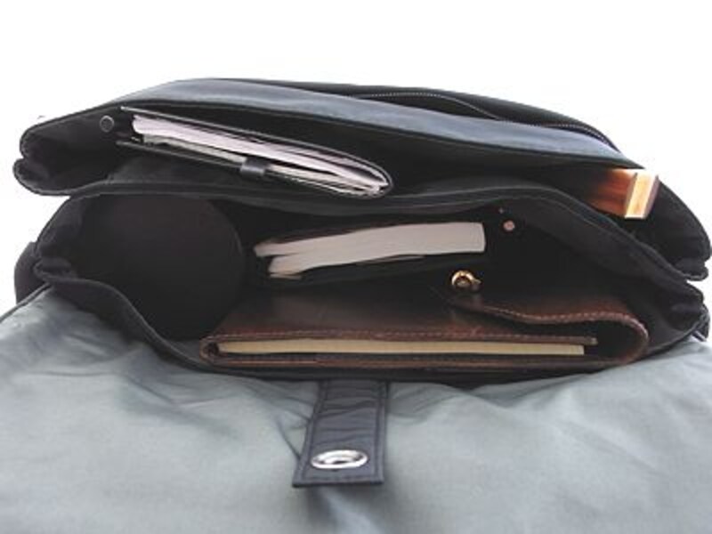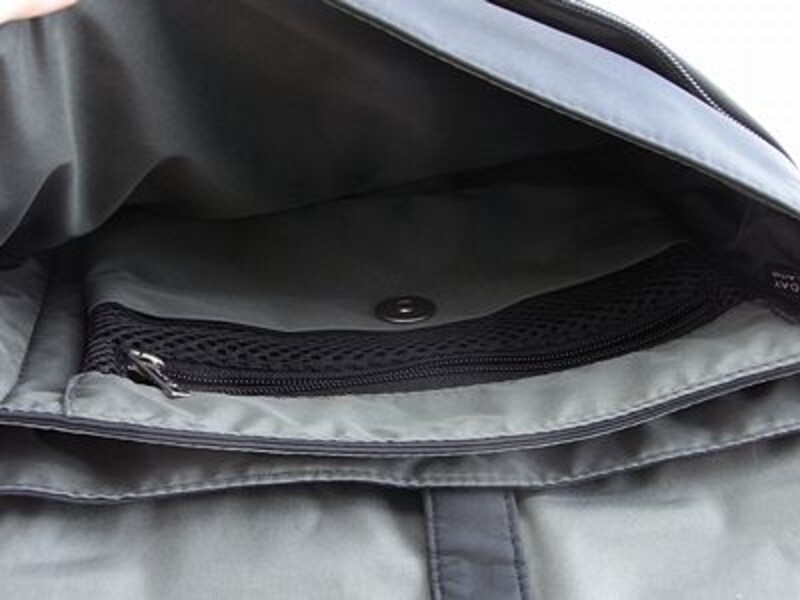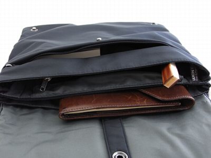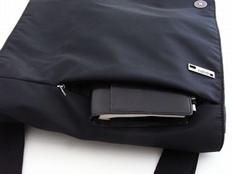 | フラップには文庫本が入る程度の小さなポケット付き。ここに重いものを入れると、フラップの操作性が悪くなるので、小さなポケットで正解だ。 |