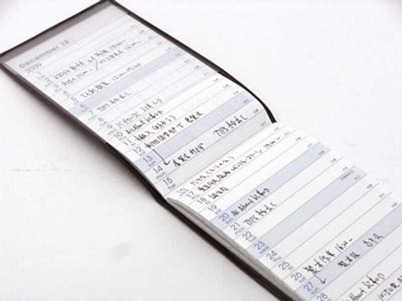 昔、こんな形の電話帳や住所録がありましたが、このハイタイドの「ポケットマンスリー NG」は、その名の通り、見開き1ヶ月のダイアリーです。1日1行のマンスリーですが、名刺サイズを縦に開いた紙面一杯を使っているので、意外に1行に書ける容量は多いのです。備忘録的なスケジューラとして、ポケットに常備しておくと、かなり役立ちます。