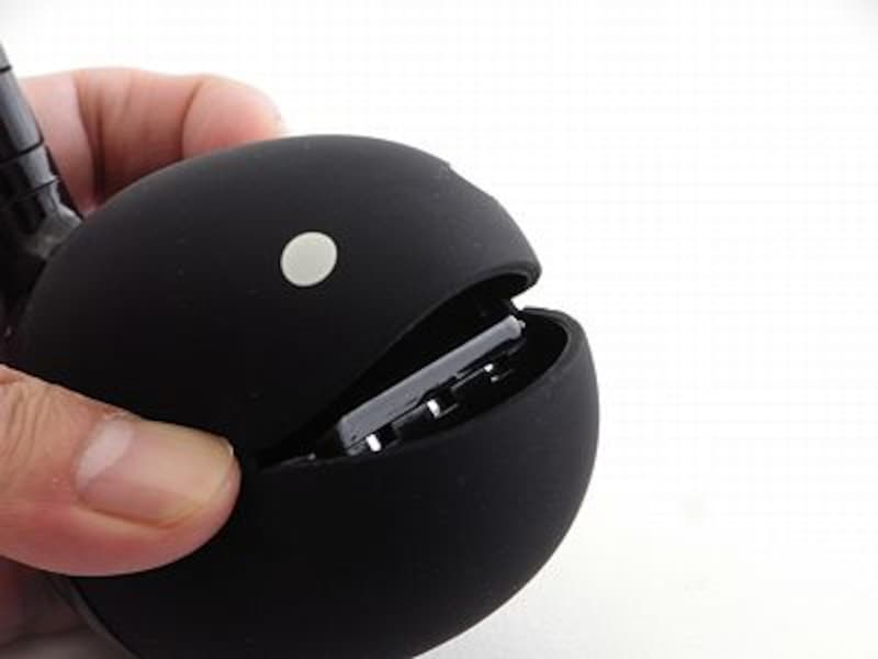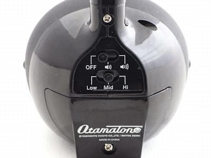 電源や音量などの操作は、おたまじゃくしの顔の後ろ側に用意された二つのスイッチで行います。上が電源オフ→音量小→音量大と切り替えるスイッチ、下が、オクターブを、低→中→高と切り替えるスイッチ。これだけですが、これで十分というか、必要最小限以上というか、3オクターブにわたって演奏できるわけで、それだけあれば、かなり自由に演奏が楽しめます。「あ、この上は出ない」というのは、オモチャ楽器にありがちの悲しみですが、オタマトーンでは、そんな悲しみを味わう機会が少なくて済みます。