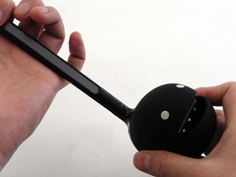もう色んな意味で素晴らしい「オタマトーン」ですが、まず、何より凄いのは、その音符を模したデザインが、楽器としてのインターフェイスとぴったり合っているということです。基本的なコントロールは、音符の棒の部分にあるリボンコントローラー的なセンサーのみ。電源を入れて、ここを指で押さえれば音が出ます。押さえる位置を変えれば、音程も変わります。上を押さえるほど音は低く、下(おたまじゃくしの顔側)を押さえるほど、高い音が出ます。