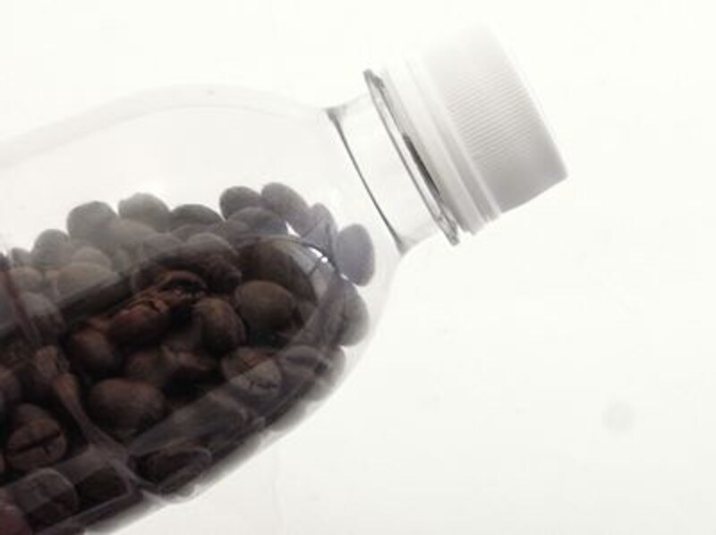 | 炭酸用のペットボトルに、焙煎仕立ての豆を封入。鮮度を保つ。 |