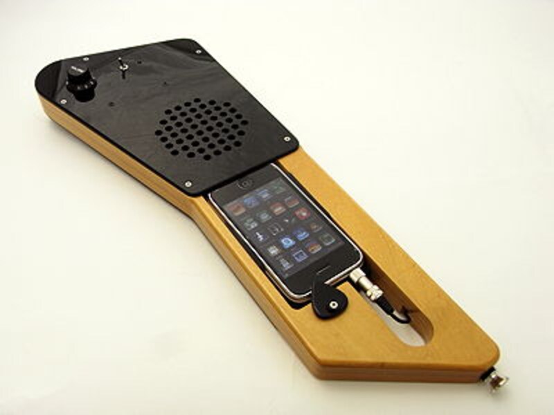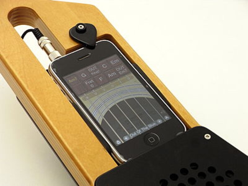 基本的には、写真で見て分かる通り、ギター型のアタッチメントというか、ゲーム風に言えばギターコントローラーというか、ネック部分にiPhoneを装着 して、ケーブルをイヤフォン端子に繋げば、あとはスイッチを入れれば、スピーカーから増幅されたiPhoneの音が聞こえる、と、それだけのものです。楽 器アプリを起動すれば、そのまま弾き語ったり、合奏したり、ストリートで演奏したりが可能で、楽器アプリがちょっと弾きやすくなって、楽器気分で演奏でき る、それだけの、でも最高に楽しいツールです。