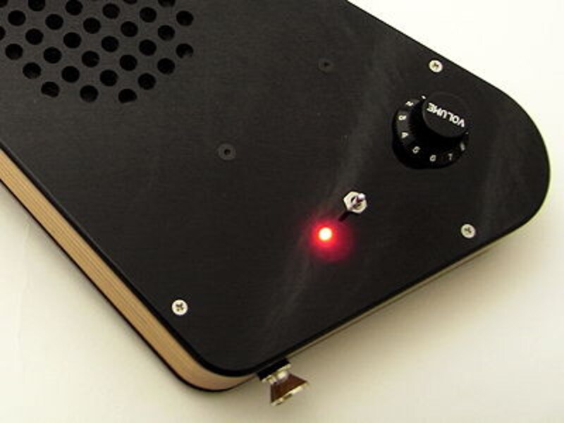 そんな「EZ-100」は、音楽レーベルでもあるバード電子の製作だけあって、とても「楽器的」であることにこだわって作られています。ボディはプライ ウッドを使って、国内でのハンドメイド、エレキギターのピックアップ切り替え風のトグルスイッチを電源スイッチに使い、ボリュームつまみはストラトキャス タータイプのものを使用、電源を入れると小さな赤いLEDランプが付くのも、エフェクター内蔵型のエレキギターのようでカッコ良いのです。オプションで無 料で付けてくれる、iPhone脱落防止用のストッパーも、ピックの形をしています。こんな細部にも「ギター的」なこだわりがあるわけです。