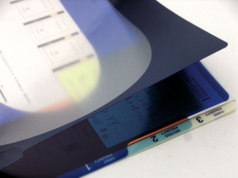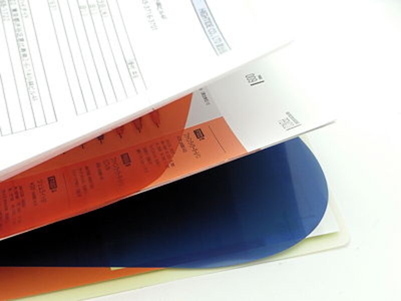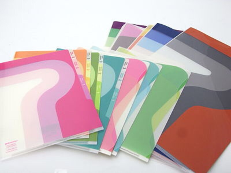 一つは、表紙に3つのタブが用意されたタイプで、仕様としては標準的ですが、そのタブと仕切りの色が合わせてあり、さらにP字状に色が重なることで、紙をどこかの仕切りに一枚入れたとき、外から、どの仕切りに入っているかが分かるようになっています。もう一つは、仕切りそのものの形が違うタイプ。曲線と色の重なり具合を上手く使って、ファイルの端を手で触るだけで、それぞれの仕切りに入った書類を、素早く取り出すことが出来ます。ちょっと言葉では説明しにくいのですが、要するに、紙のどの部分が露出しているかで、紙が入っている仕切りを区別できるデザインになっているのです。色の重なり具合もとてもキレイです。サイズは、A4とA5、両方用意されています。