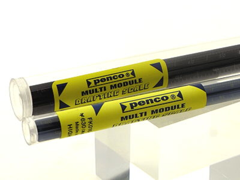 | PENCO「ドラフティングスケール」各630円(税込) 上が10cm目盛りのタイプ、下が16cm目盛りのタイプ。色は写真の黒、青の他、金、銀、赤、緑、ピンクの7色。 |
